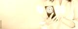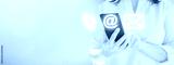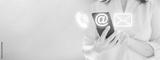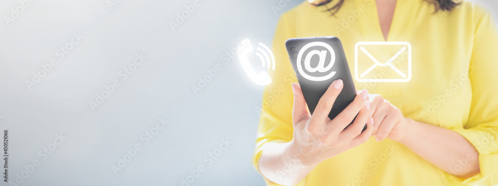 contact us. Close up of women's hands holding cellphone smartphone. Woman holding cell phone with with mail, phone, email icon. cutomer support concept. copy space. grey background