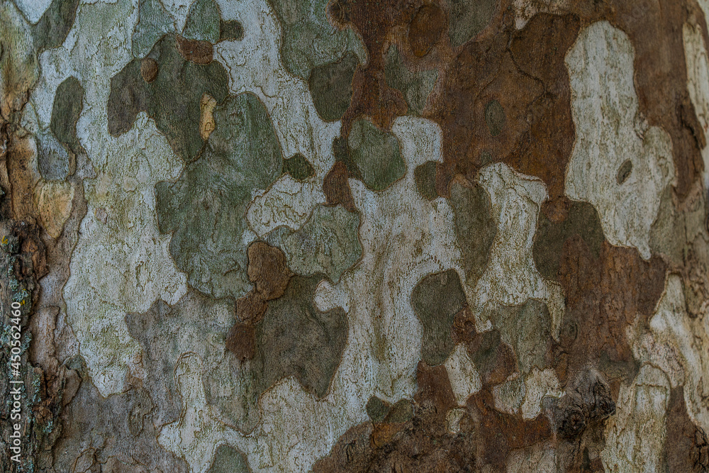 Forest, tree trunk seen up close. Bark of the trunk of a plane tree.