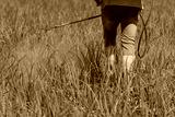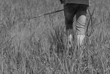 A scenic view of a worker watering the field with special equipment