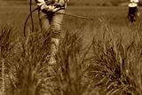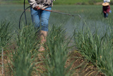 scenic view of a worker watering the field with special equipment