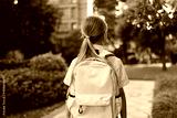 Back to school. Little girl with yellow backpack from elementary school outdoor. Kid going learn new things 1th september after end Coronavirus covid-19 quarantine and self isolation