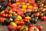 Close-up. Fresh tomatoes of different colors, farm harvest beautiful bright background