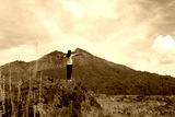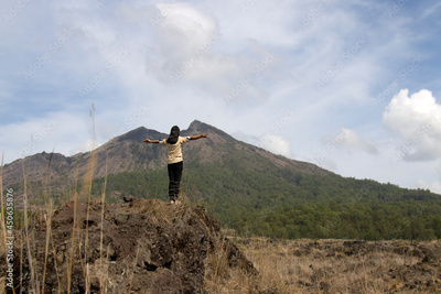 Woman standing alone on high rock, with arms raised against the top of mountain with bright blue sky view background. Mount Batur, Kintamani, Bali, Indonesia.