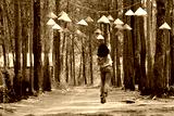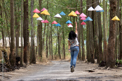 Woman jumping holding colorful lantern on green trees background in the park. Fun time and be free. Freedom and happiness concepts.