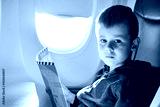 Cute little boy traveling by an airplane. Six years old boy reads the brochure.