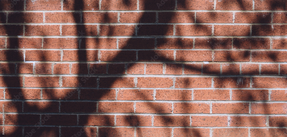 Brick wall background. Wide panorama of shadow and light of branches tree on old red texture brick wall, Minimal natural banner backdrop