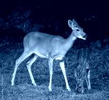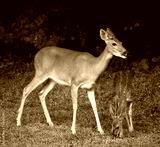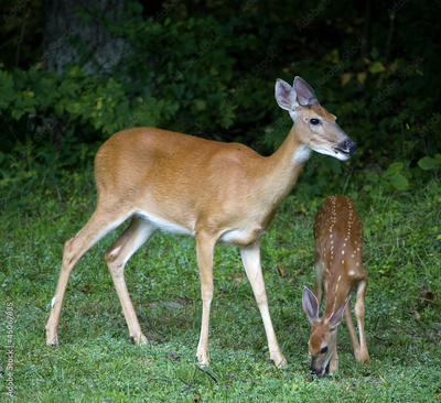 Whitetail doe On watch as its fawn in spots grazes on green grass