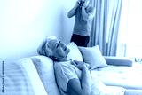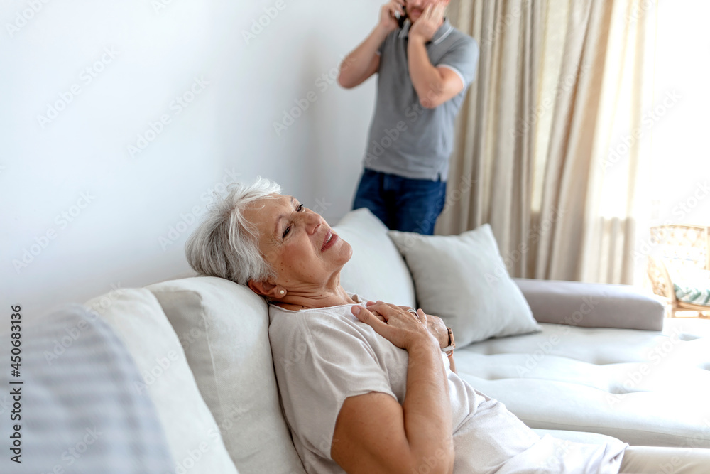 Shocked young man holding phone calling emergency ambulance worried about his grandma at home during the day. Young man asking for help from a sick senior woman. Healthcare and medicine concept.