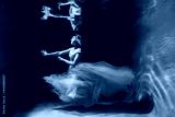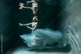 underwater photography. Girl mermaid. model in wate .In a blue flying dress. on dark background