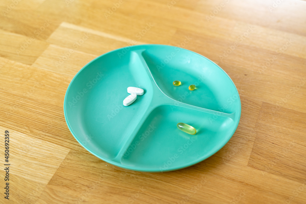 Green plate with dividers filled with pills and capsules. Biohacking movement. Wellbeing concept. Modern medicine with antibiotics.