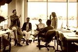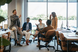 Team of five multi-ethnic employee having fun working together in an open plan office with big windows.
