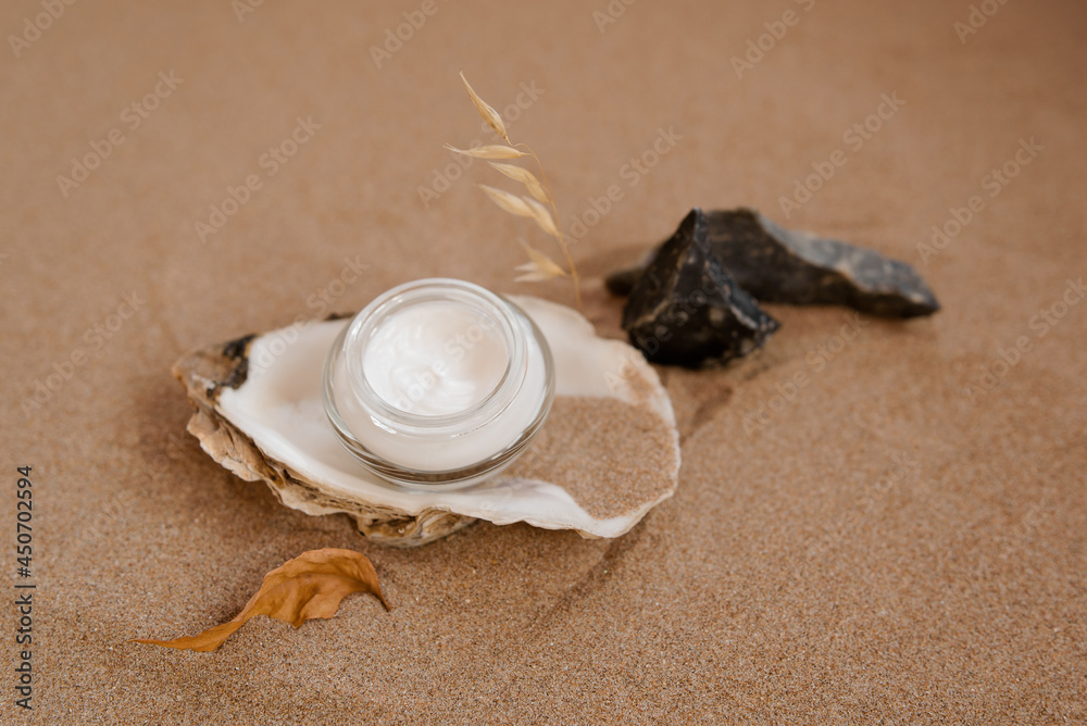 Caring cosmetics in an oyster shell on the sand. Eco-friendly organic cosmetics.