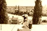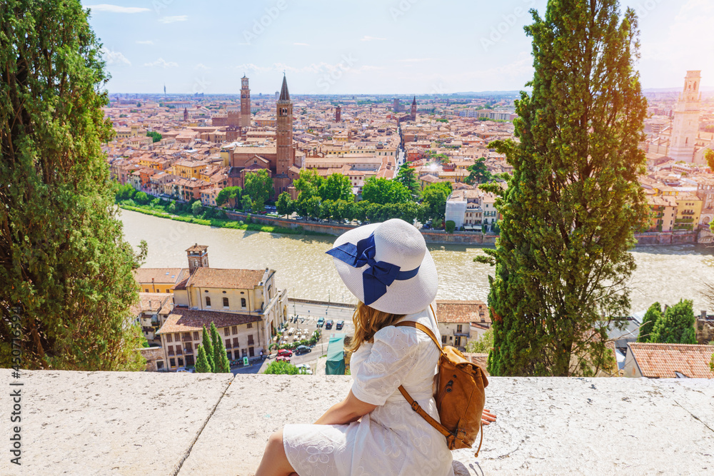 Woman enjoying beautiful view on Verona city in Italy on the sunset. Verona is famous city of love in the north of Italy.