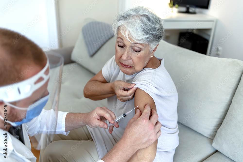 Young nurse with surgical mask giving injection to senior woman at hospital. Close up of male doctor injecting vaccine into patients arm with syringe. Doctor makes vaccination to senior woman.