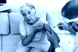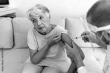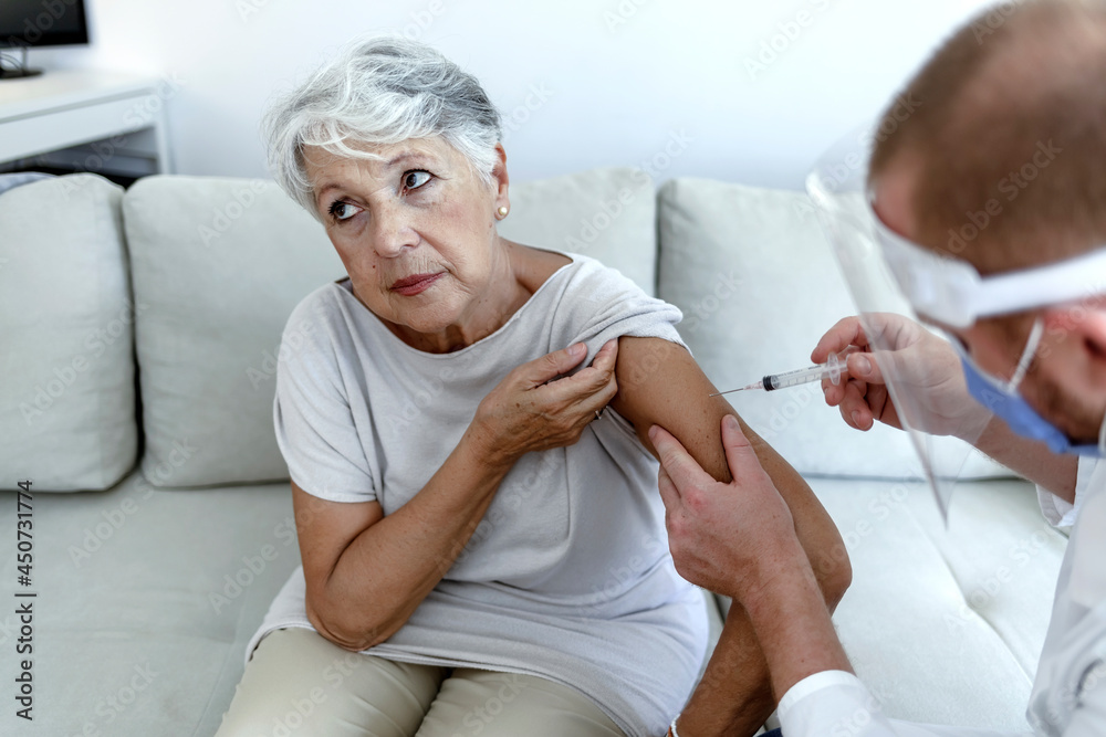 Young nurse with surgical mask giving injection to senior woman at hospital. Close up of male doctor injecting vaccine into patients arm with syringe. Doctor makes vaccination to senior woman.