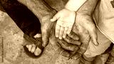 The hand of a child lies on the hand of a working man. Communication and continuity of two generations. Grandfather and grandson.