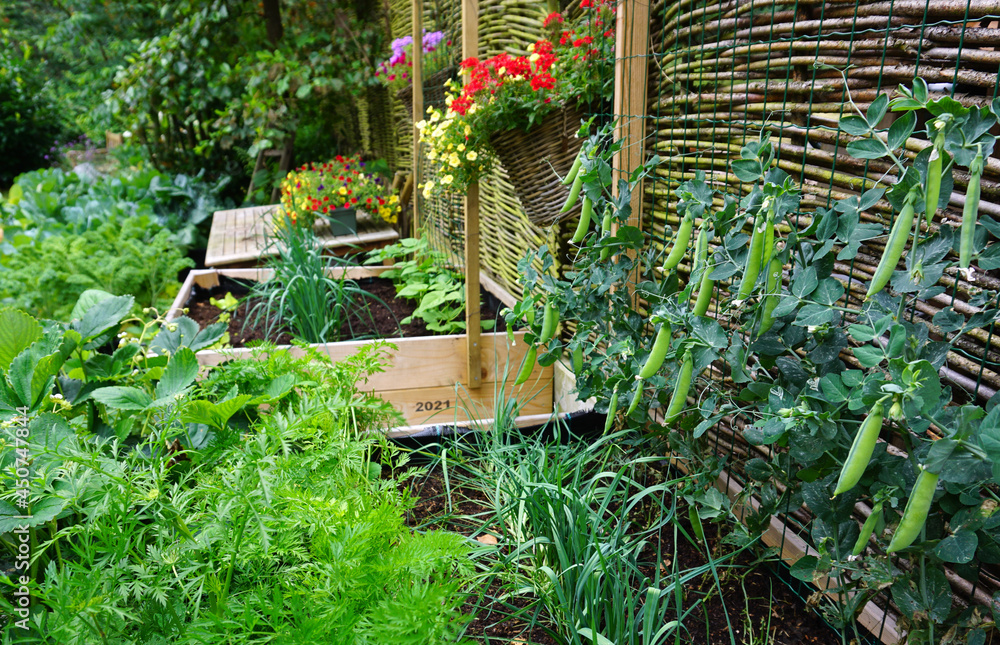 Fresh Organic vegetable garden with wooden raised beds. urban vertical garden. grow your own homemade vegetables.