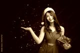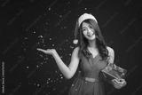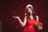 Beautiful young woman in red dress with gift box at celebration party with confetti falling on her, New Year celebration concept