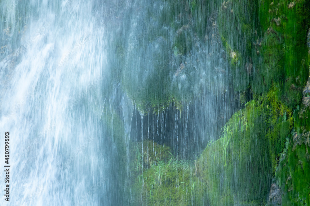 CLOSE UP: Refreshing mist rises from a waterfall flowing down mossy rocks.