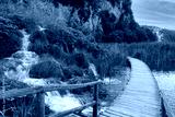 Empty boardwalk crossing a colorful lake in Plitvice runs past a glassy river.