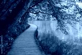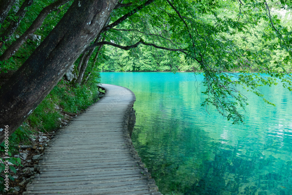 Scenic empty walkway runs along the shore of emerald lake in Plitvice park.