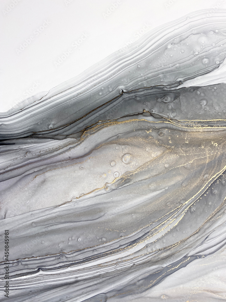 Abstract grey art with gold — black and white background with beautiful smudges and plisse made with alcohol ink and golden paint. Grey fluid texture resembles marble, smoke, watercolor or aquarelle.