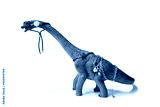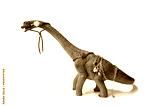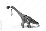 Brontosaurus toy with jewels on the body and in the mouth. Isolated on white background with natural shadow.