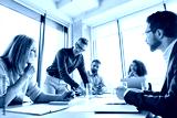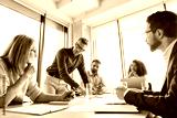 Male mature caucasian ceo businessman leader with diverse coworkers team, executive managers group at meeting. Multicultural professional businesspeople working together on research plan in boardroom.