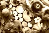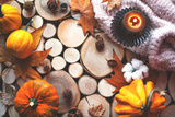 Beautiful autumn composition with pumpkins and yellow leaves.