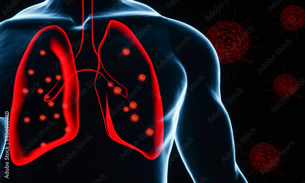 body x-ray image Shows lungs destroyed by COVID-19 virus. Lungs attacked by Coronavirus. Respiratory system. from the epidemic. 3D rendering.
