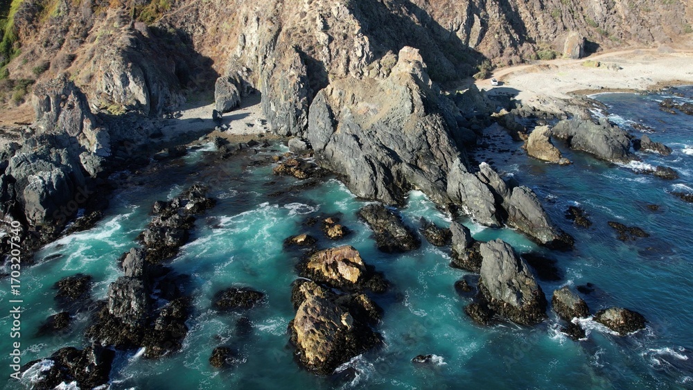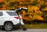 Attractive brunette woman in grey coat, black boots and beige scarf sitting in car trunk. In hand she hold multicolored maple leaves. Picturesque autumn season. Travelling by car. Beauty in nature.
