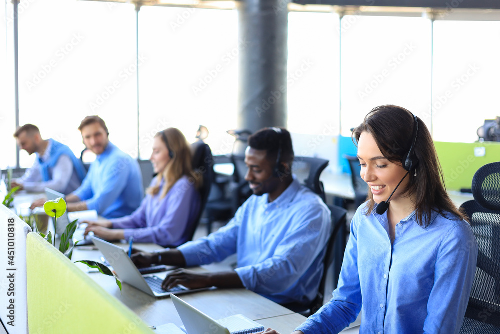 Young employee working with a headset and accompanied by her team