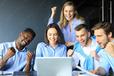 Happy business people laugh near laptop in the office. Successful team coworkers joke and have fun together at work.