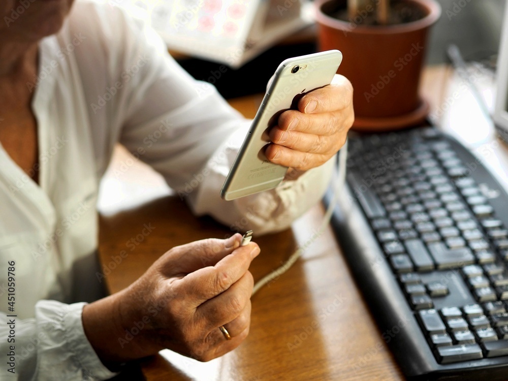 Female hands connect the charger to a smartphone at a work desk.