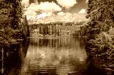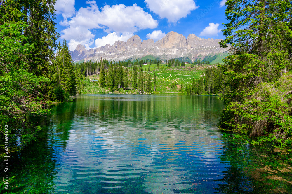 Paradise scenery at Karersee (Lago di Carezza, Carezza lake) in Dolomites of Italy at Mount Latemar, Bolzano province, South tyrol. Blue and crystal water. Travel destination of Europe.