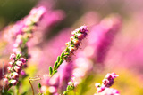 Beautiful blooming pink heather in a forest clearing at sunny day. Small lilac purple flowers on long stems. Flowering, gardening. Calluna vulgaris on green blurry background. Flower store concept.