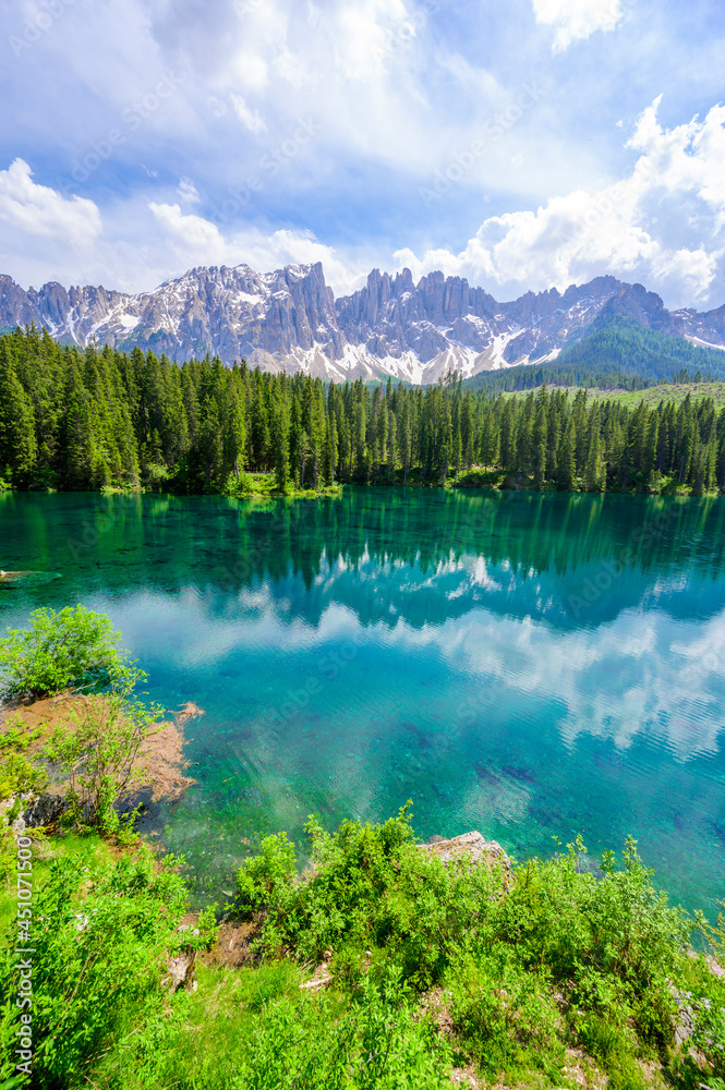 Paradise scenery at Karersee (Lago di Carezza, Carezza lake) in Dolomites of Italy at Mount Latemar, Bolzano province, South tyrol. Blue and crystal water. Travel destination of Europe.