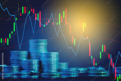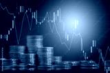 Double exposure of finance graph , stationary and rows of coins for goal office , finance and business concept background and forex trading graph with economy trends business or finance background.