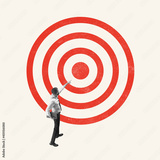 Art collage. Young man, office worker, employee standing in front of target isolated on light background. Concept of finance, economy, goals, achievements, occupation