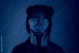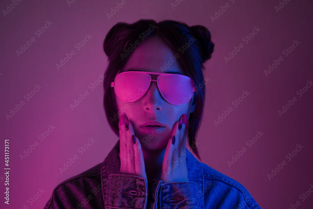 Surprised portrait of fashionable woman in synthwave style in pink neon light.