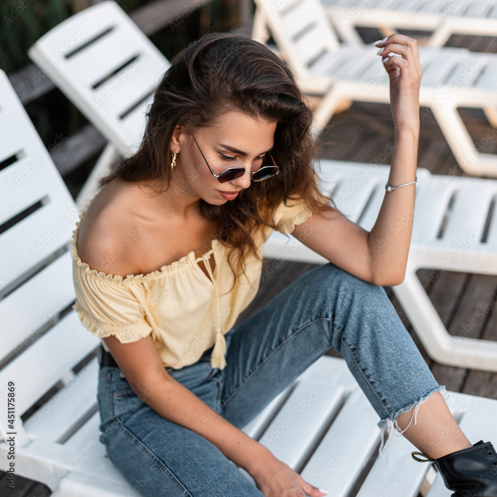 Cool hipster young woman with fashionable sunglasses and curly hairstyle in trendy classic blue jeans and summer blouse sits on a sunbed on the beach near a sea. Female casual stylish look outfit