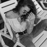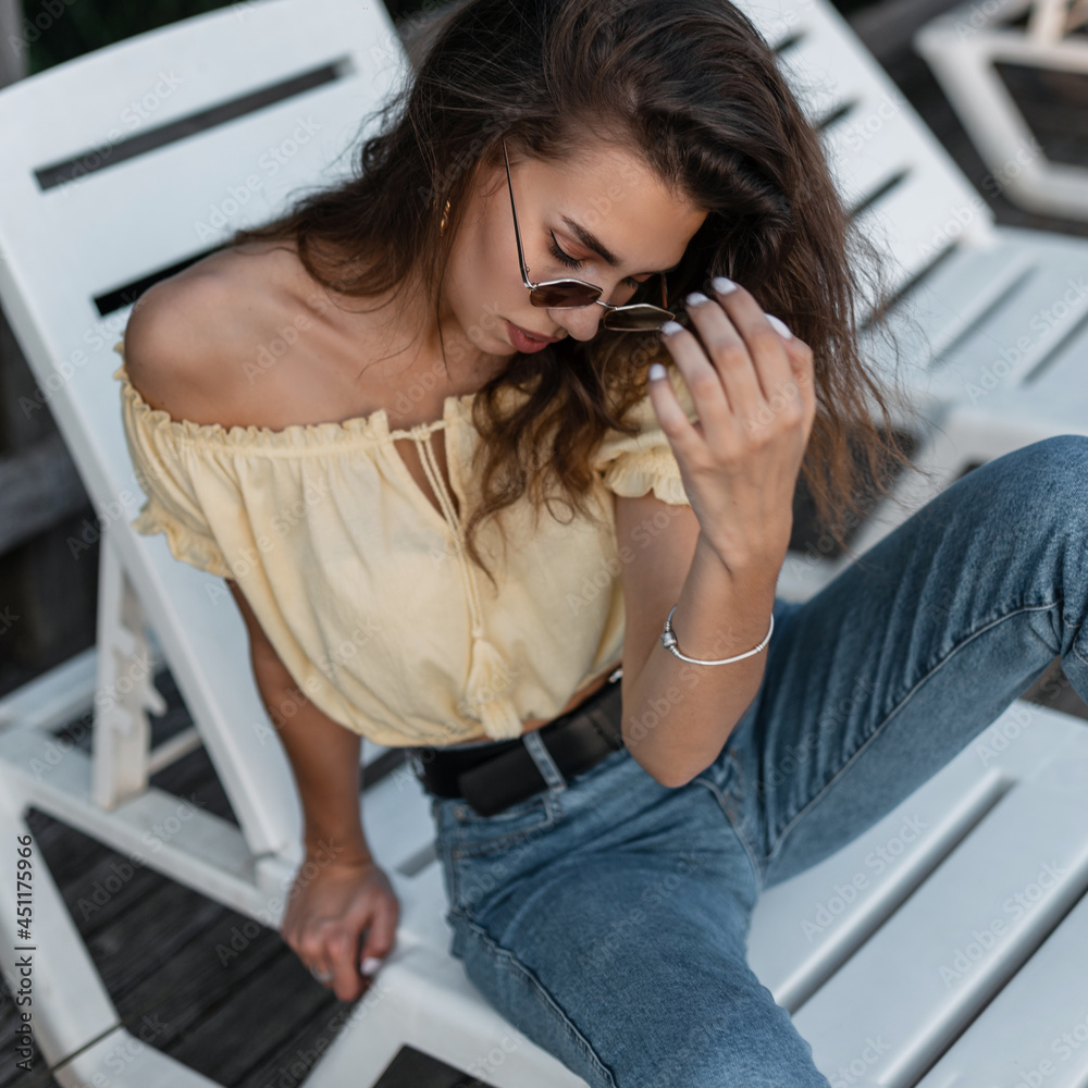 Fashionable portrait of trendy hipster woman with stylish sunglasses in yellow top blouse and blue vintage jeans sitting and rest on beach lounger
