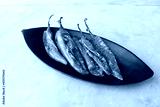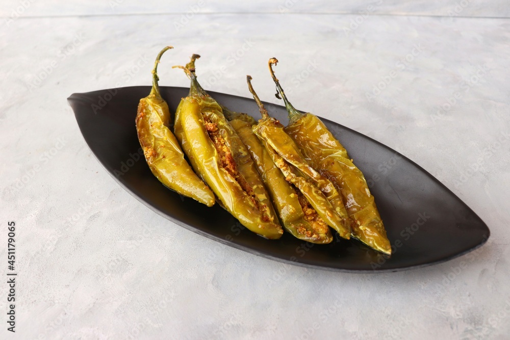 Stuffed Green Chillies fry, Bharwa Masala Mirch or Bharli Mirchi, sandgi Mirchi. Served on a black plate over a light background. Copy space.