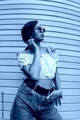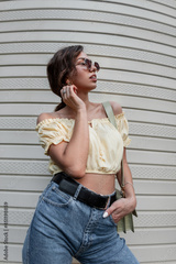 Beautiful young sexy hipster girl with vintage round sunglasses in fashionable casual clothes with jeans, top blouse and bag stands and poses near the wall in the city