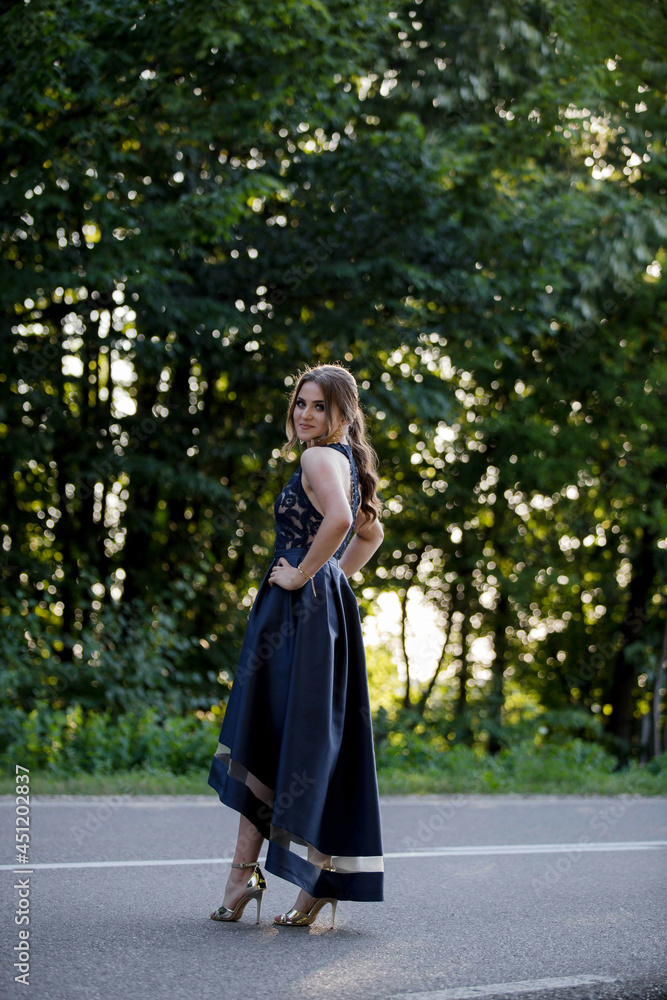 Young woman posing on a street in a blue dress