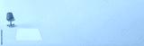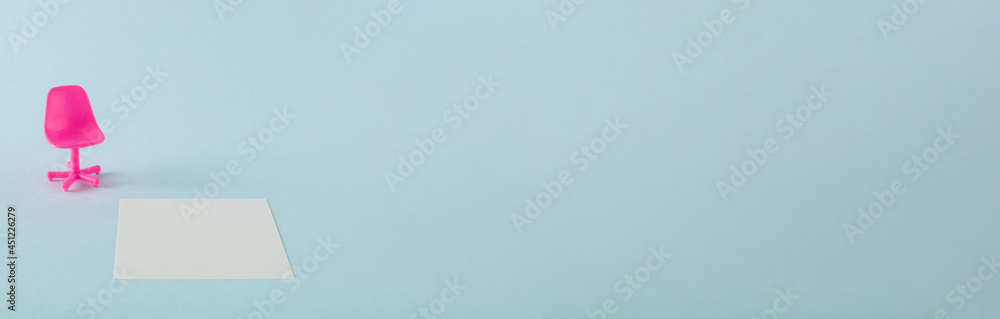 Creative idea made pink office chair and white paper on blue pastel background. Minimal composition.