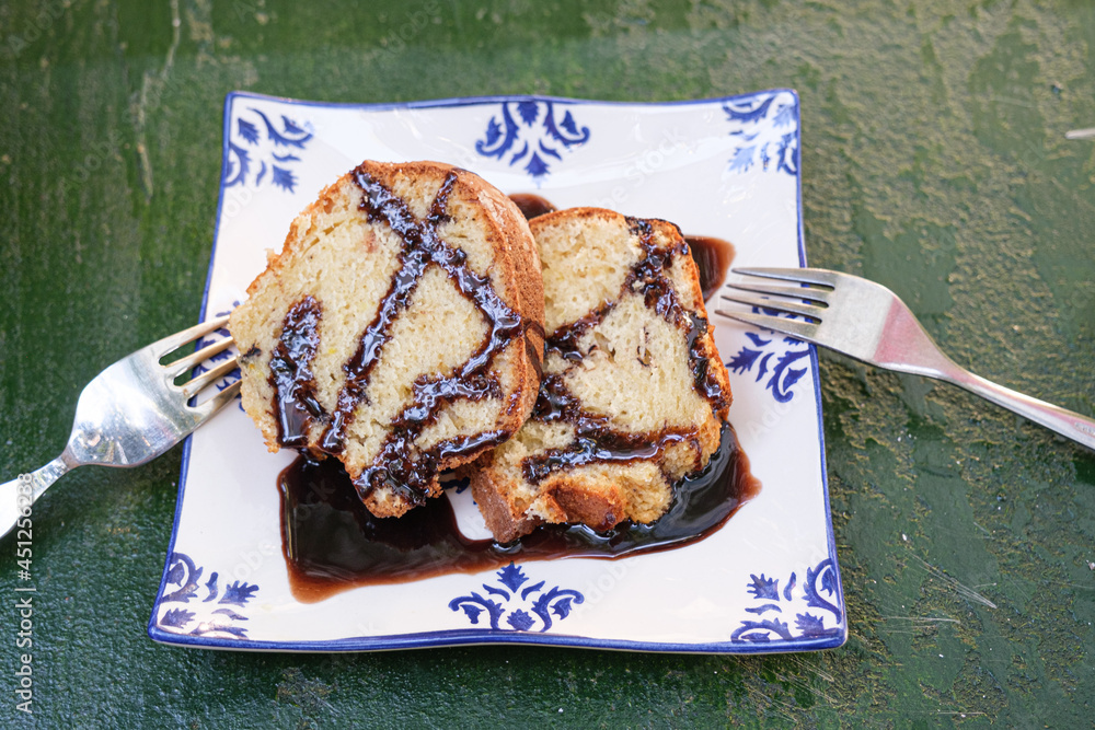 Cakes with chocolate sauce on plate, two cakes ready to be eaten.
