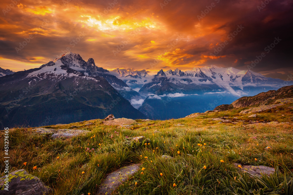 Wonderful view of the mighty Mont Blanc glacier. Location Chamonix resort, France, Europe.