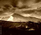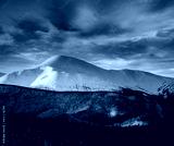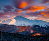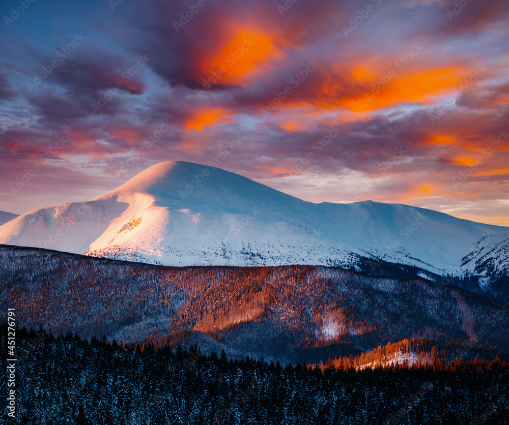 Incredible sunset in a mountain valley on a frosty evening. Image of a bright epic sky.