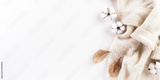Autumn composition. Cotton flowers, autumn leaves and women sweater on white background. Flat lay, top view with copy space.